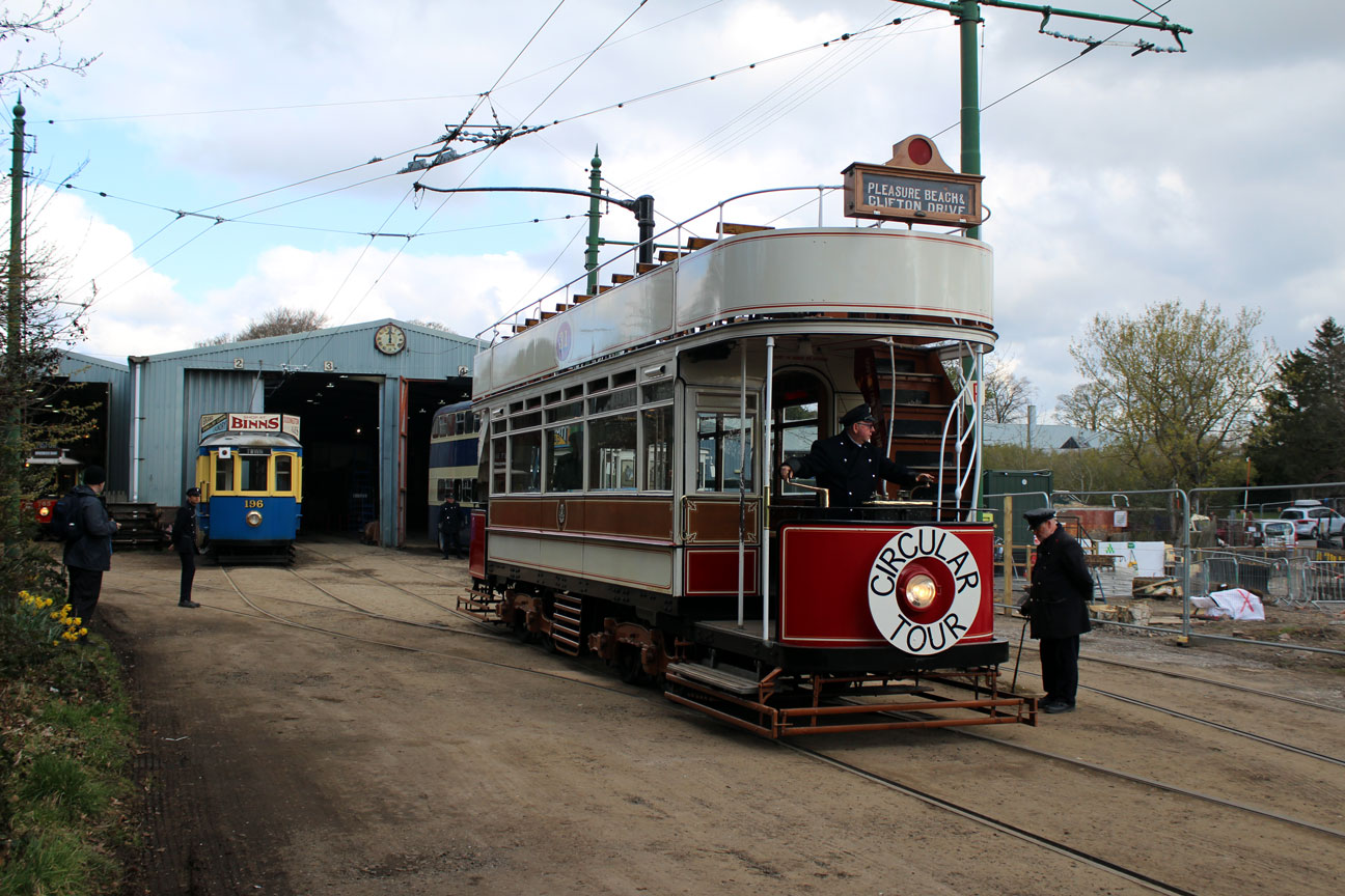 The highest and lowest mileage trams in the resident Beamish fleet for 2019 are seen outside the depot on 13th April as Blackpool 31 enters service and Oporto 196 waits. (Photograph by Gareth Prior)