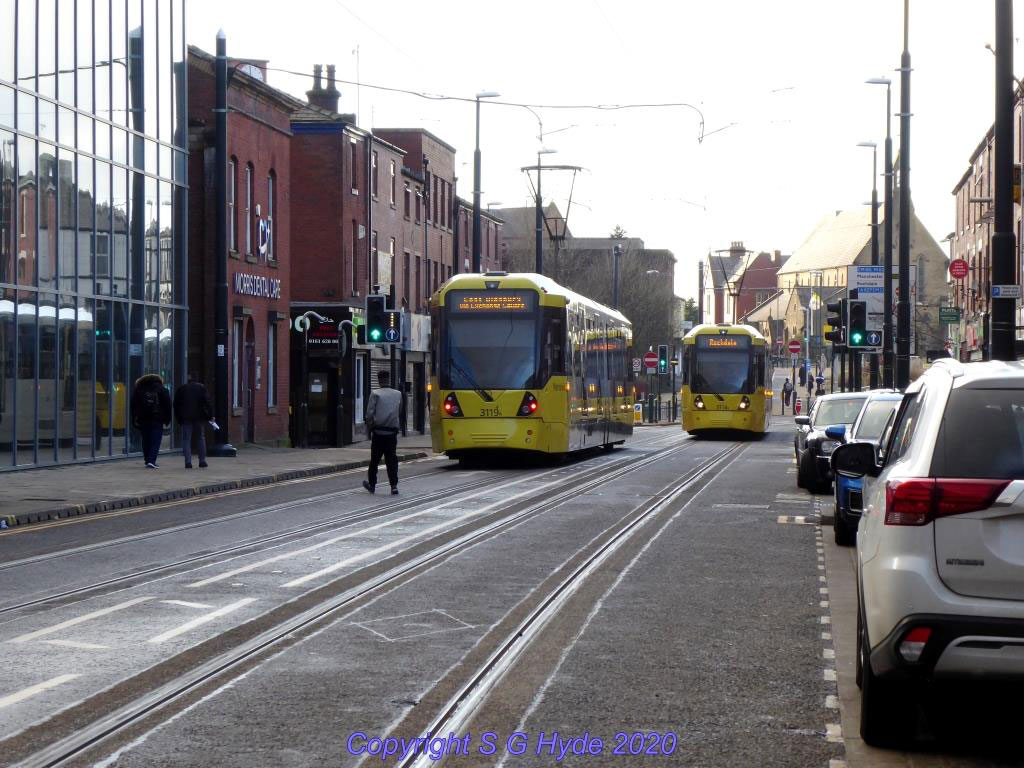 Moving along Union Street and looking back towards King Street we catch 3119 heading for East Didsbury and passing 3114 on an East Didsbury to Rochdale service.