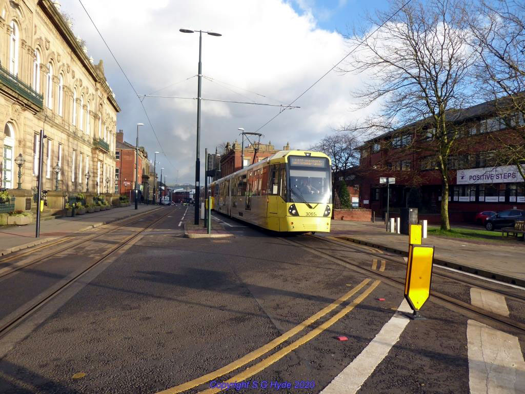 Now standing at the east end of Oldham Central stop looking towards Oldham Mumps the camera catches a 3065 coupled to 3093 approaching Central on their way to East Didsbury. The Lyceum building on the left still possesses remnants of overhead line rosettes from the first generation tramways.