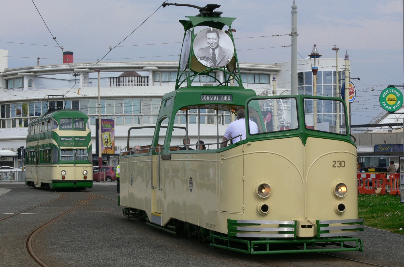 Two of the trams that are potentially ready to commence the heritage operation for 2013 – Boat 230 and Balloon 717 – repose at Pleasure Beach last August, with 230 standing by the heritage tram loading stop. (Photo by Andrew Waddington)