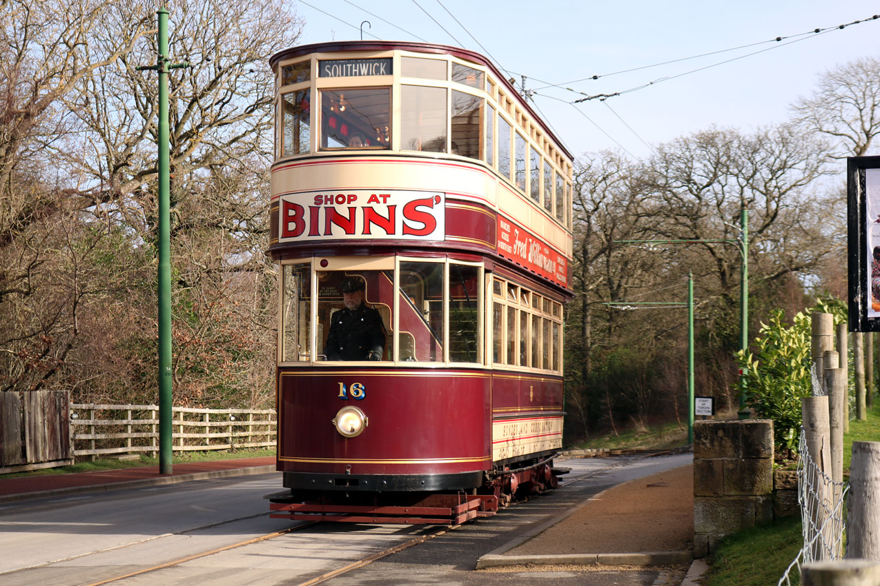The third tram in service, Sunderland 16, approaches the Entrance from Pockerley.