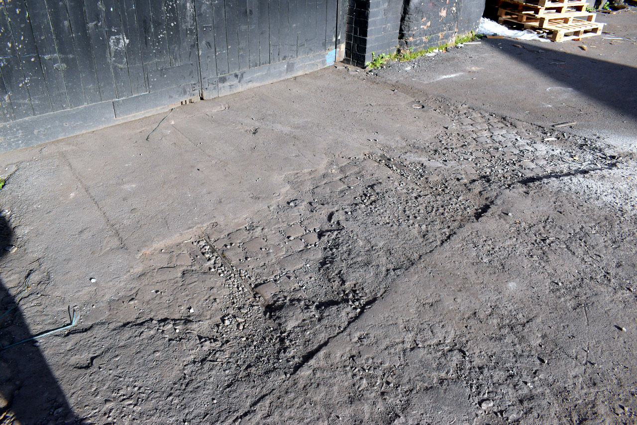 Concrete may have been put on top but with it starting to crumble away you can see the setts and also some remaining track.