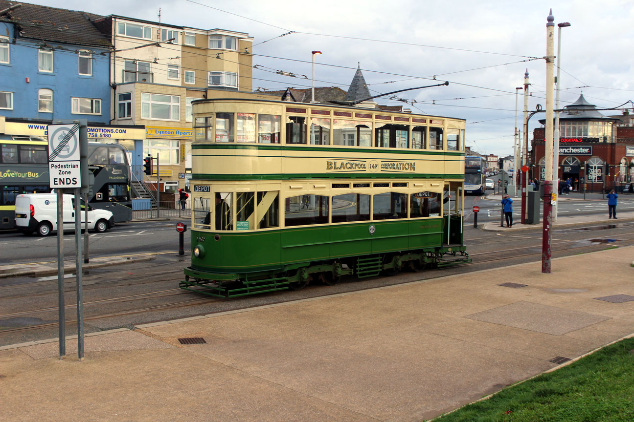 In this view we see 147 on 29th September 2019 as it heads towards the crossover at Foxhall to return to depot. The refresh it had received during 2017 saw the Blackpool Corporation legend applied to the between deck area and its Michael Airey name has been relocated to alongside the entrance. (Both Photographs by Gareth Prior)