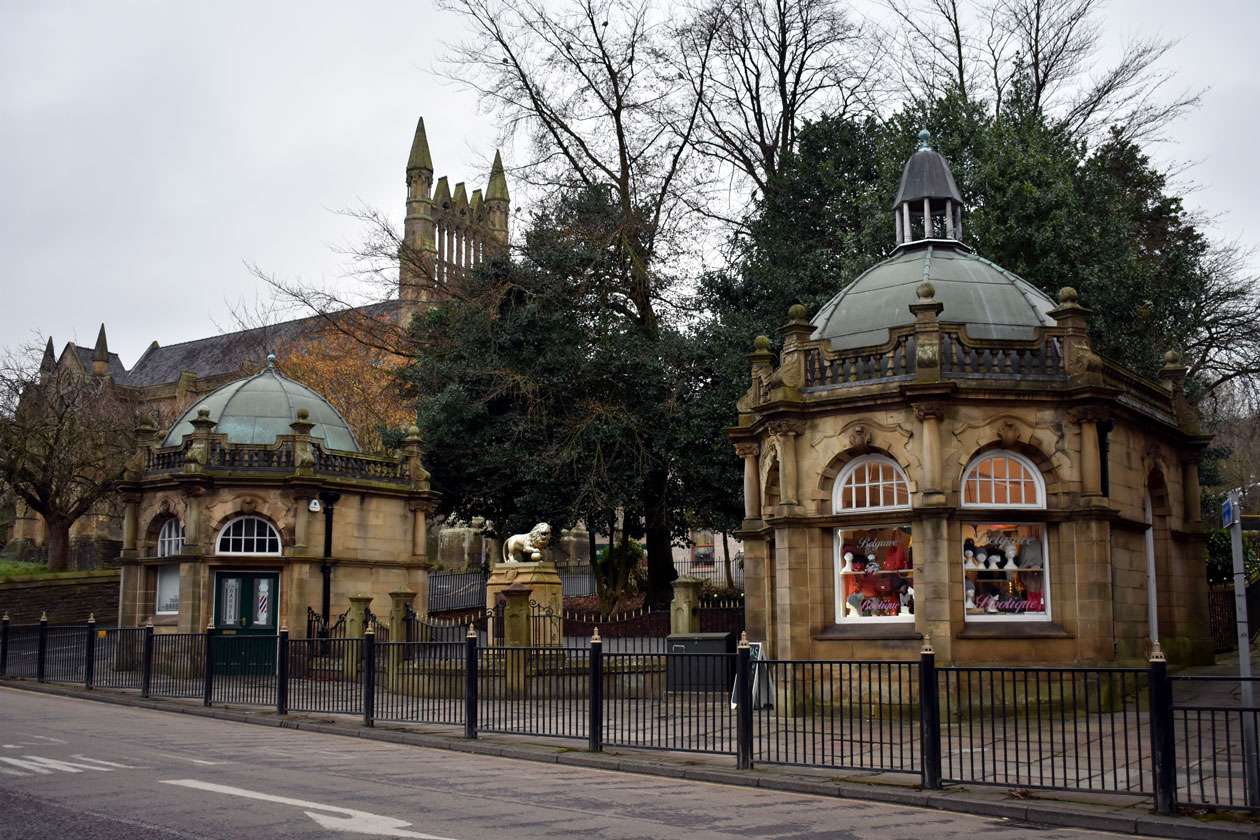 The two tram waiting shelters on Bolton Road in Darwen town centre, flanking a memorial to the second Boer War. This ended in 1902, the year the shelters, designed by Borough Engineer R.W. Smith-Saville, are dated.