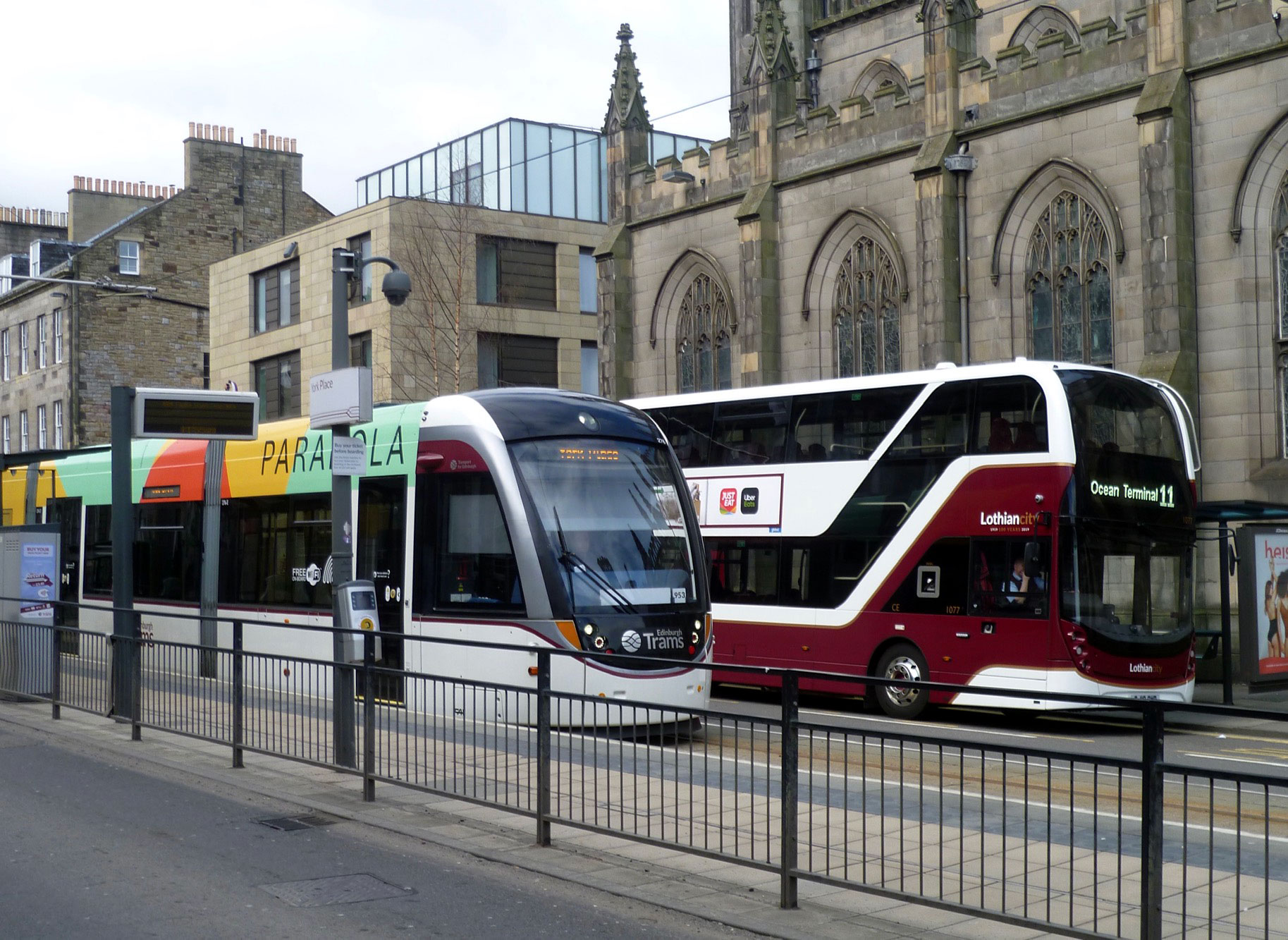 In this photo we see 276 at the stop. This tram is one of those to carry brightly coloured adverts for Parabola. Alongside at the bus stop is a bus on Lothian Buses route 11 to Ocean Terminal. The bus is an Alexander Dennis Enviro 400XLB which was delivered to Lothian Buses in March 2019, continuing the current vogue for exposed staircases. (Photograph by Roy Calderwood, 30th March 2020)