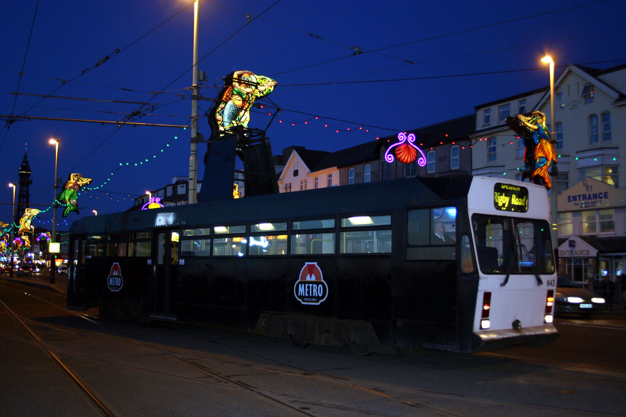 In 2011, 643 was in one of the least inspiring liveries ever seen on a Blackpool tram which the remnants of an old all over advert replaced by Metro Coastlines logos on the Black and White base. In this view we see the tram leaving the Prom for one last time on 6th November 2011.