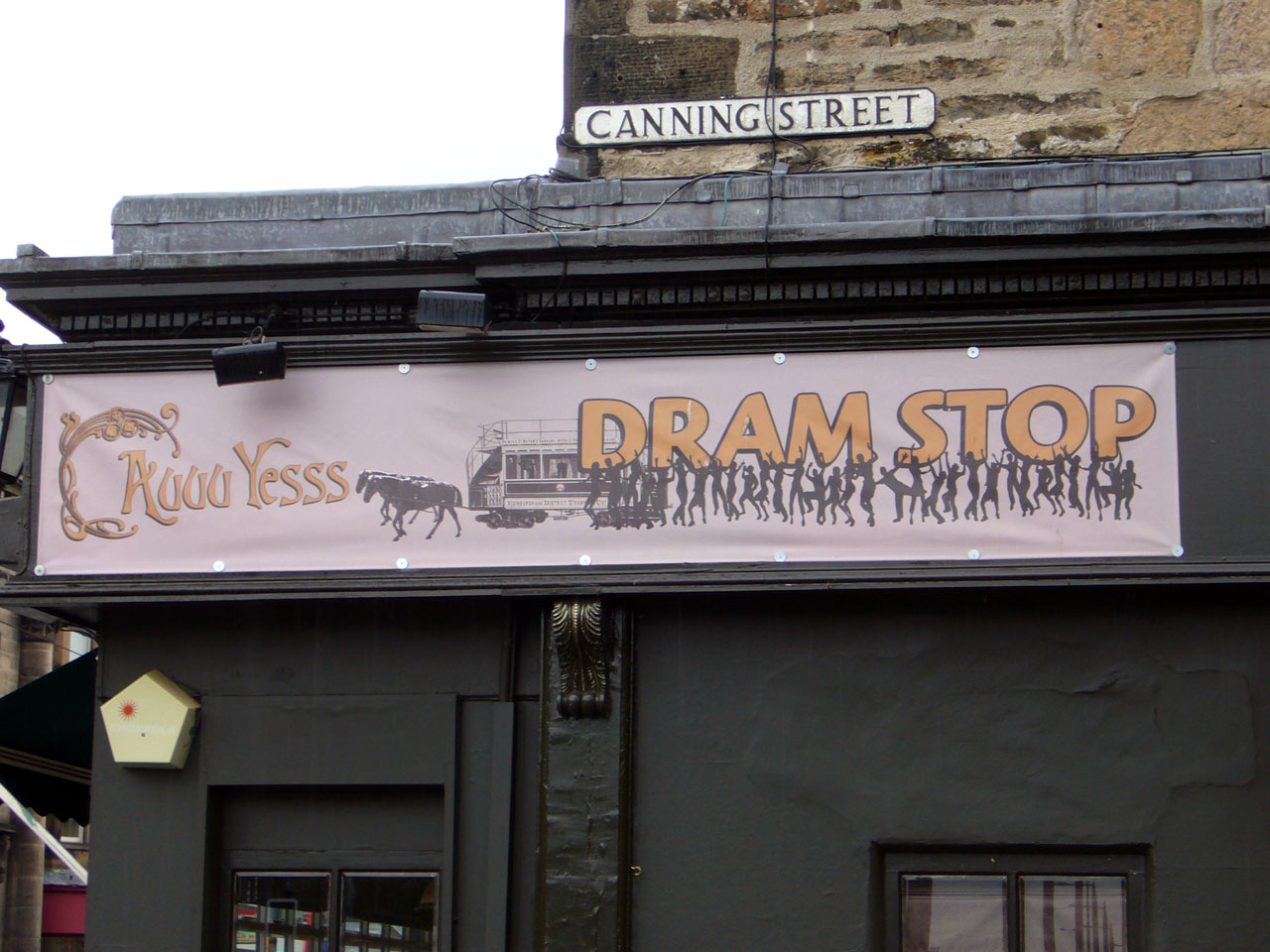 Whilst located on the side of a pub this sign isn’t strictly a pub sign as it is just a banner with the “witty” line “Dram Stop”. The image of a tram would appear to be an Edinburgh Cable Tram being hauled by two horses! It is on the side of the Aubar pub in Shandwick Place and is only a few metres away from the West End tramstop.