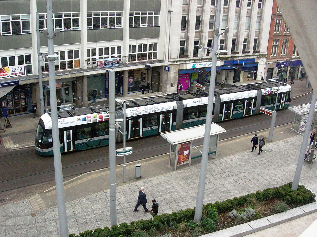 One of the Incentro trams is seen here at the Old Market Square outbound platform. Still in the original fleet livery and with advertising along the entire length of the tram – although not full height on the centre section – the tram, which can’t quite be identified, is operating a service from Station Street to Hucknall.