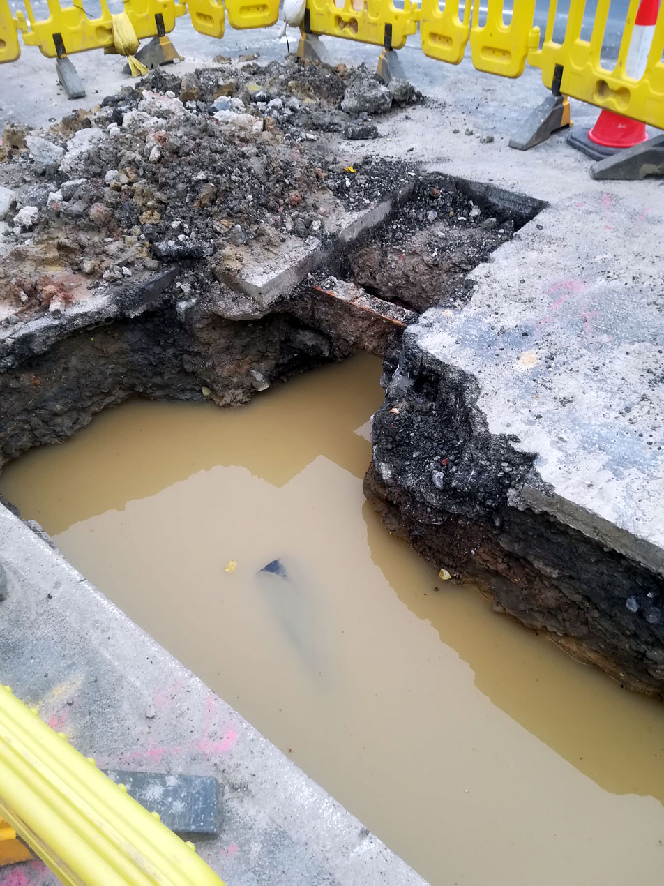 The works here are on behalf of British Gas and whilst the weather may have brought a downpour and filled the hole you can see a small section of track in the centre of image, floating between the remaining parts of tarmac.