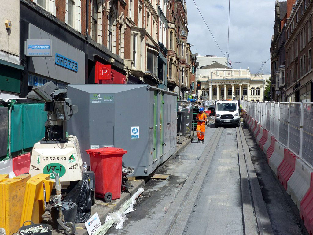 Market Street (between Royal Centre and Old Market Square) where new track is in place but the final top surface is still be put down. (All Photographs by Alan Murray-Rust and licensed for reuse under Creative Commons. Further images from this visit can be viewed on the Geograph website.)