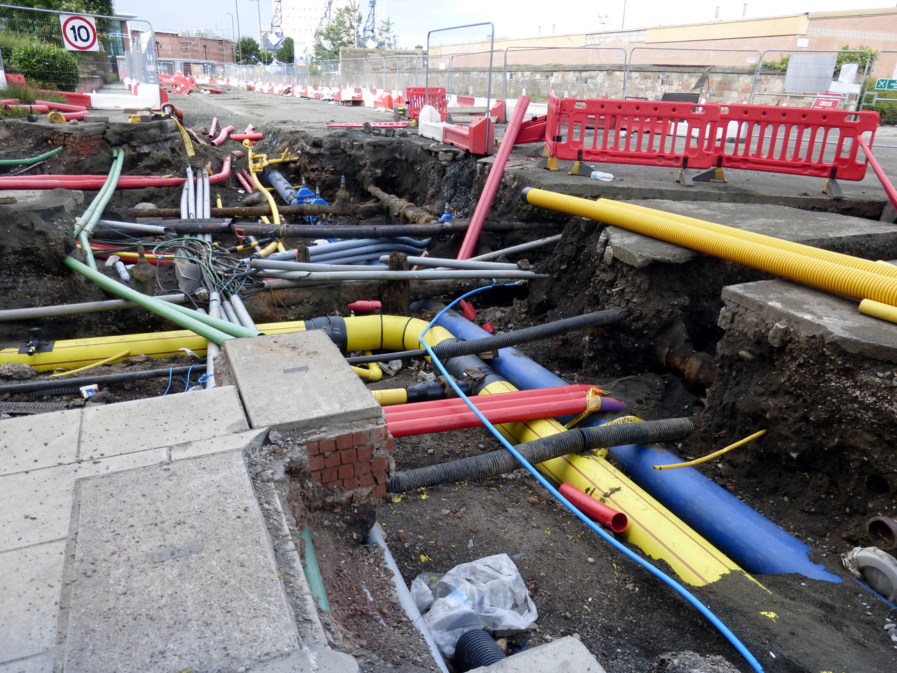 If you’ve ever wondered why utility diversions are such an important part of construction works this photo on Constitution Street at the junction with Tower Street may give a clue! The myriad of pipes and cables are all in the path of the tramway and will need moving before the road surface is put back and tracks laid. Imagine if these remained in place, the track was put down and then various utility companies had to come along and do maintenance work underneath the track!