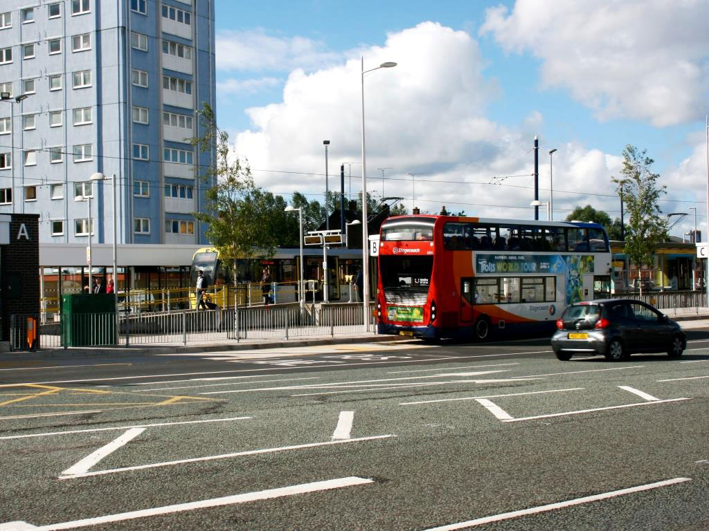 A view taken from across Wellington Road shows a bus standing at one of the satellite shelters at Stand B waiting to depart on route 216 to Manchester paralleling the much of the route the tram seen alongside it will take.