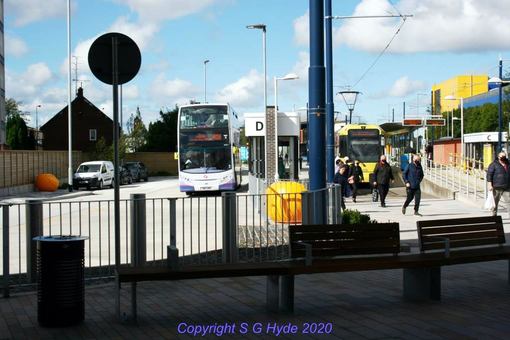 In this photograph a First Manchester Enviro 400 on route 409 from Rochdale via Oldham is seen passing the trams top where 3078 awaits its departure.
