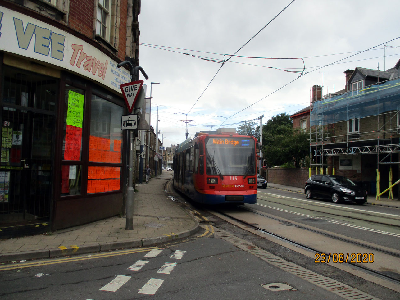 These two images show 115 having just turned onto Holme Lane and bound for Malin Bridge with a service which would have started at Sheffield Station with the route beyond the station to Halfway closed at the time due to rail replacement works. 115 was delivered to Sheffield in February 1994. (Both Photographs by Stuart Cooke, 23rd August 2020)