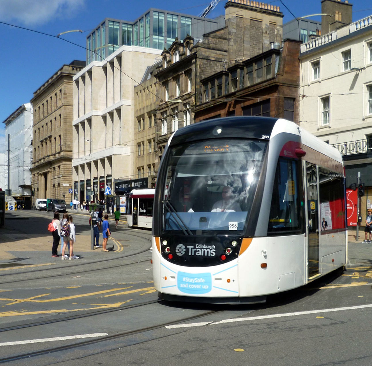 Proudly showing off its mask 263 is just turning out of South Saint Andrew Street as it enters Princes Street towards the start of its journey to the Airport. For those counting this was taken on day 120 since lockdown restrictions were first introduced. (Photograph by Roy Calderwood, 21st July 2020)