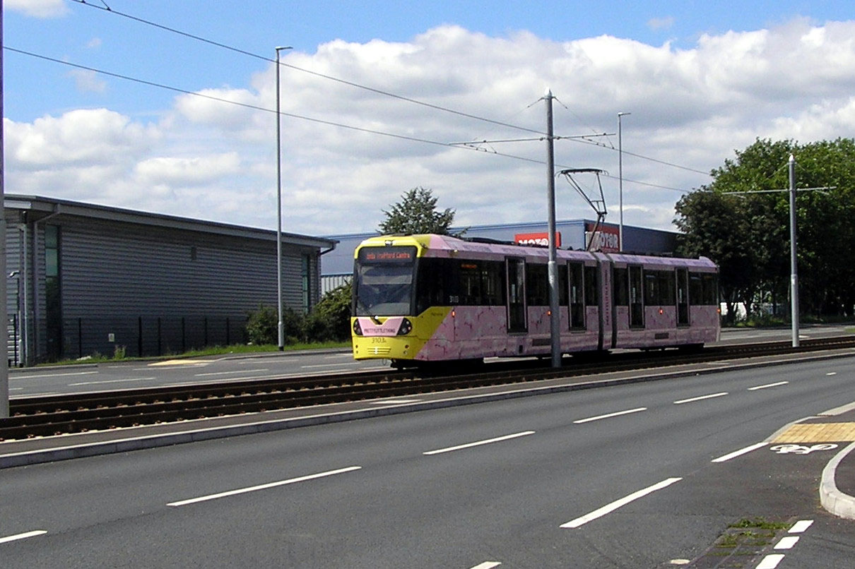 This image shows 3103 heading a service to intu Trafford Centre at Village Way. (Photograph by Keith Chadbourne, 12th July 2020)