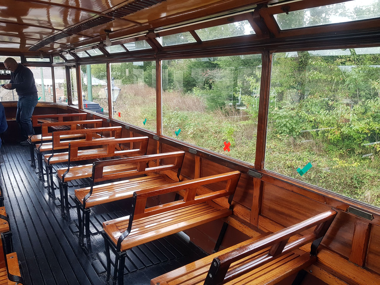 On board the trams and as with some light rail systems across the country some seats are unavailable for use. On Leeds 399 these are shown by red crosses and green ticks on the windows.
