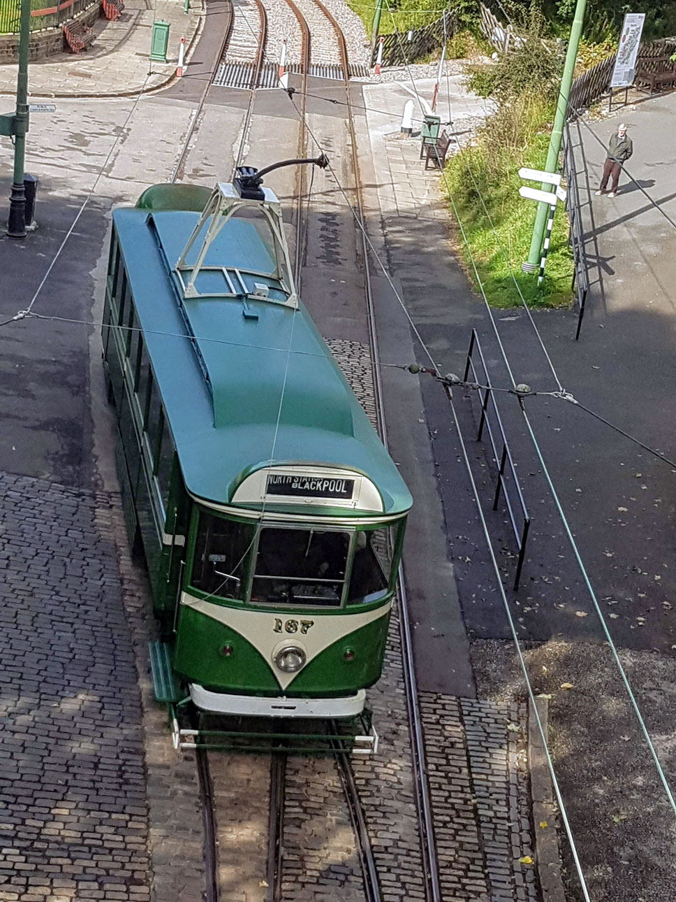 Blackpool 167 is seen from the Bowes Lyon Bridge as it heads up to Glory Mine.