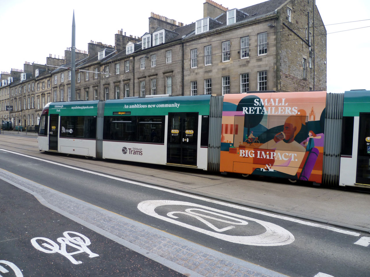 268 leaves York Place for the Airport with more of the advert seen here. The short stub of track here will form the Airport bound track from Newhaven when that extension opens in 2023. (Photographs x3 by Roy Calderwood, 17th October 2020)