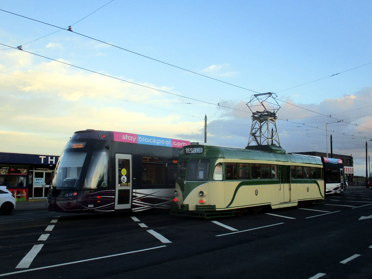 As 621 takes a break on Fleetwood Esplanade it is passed by Flexity2 005 which has just started a full length Fleetwood to Starr Gate journey.