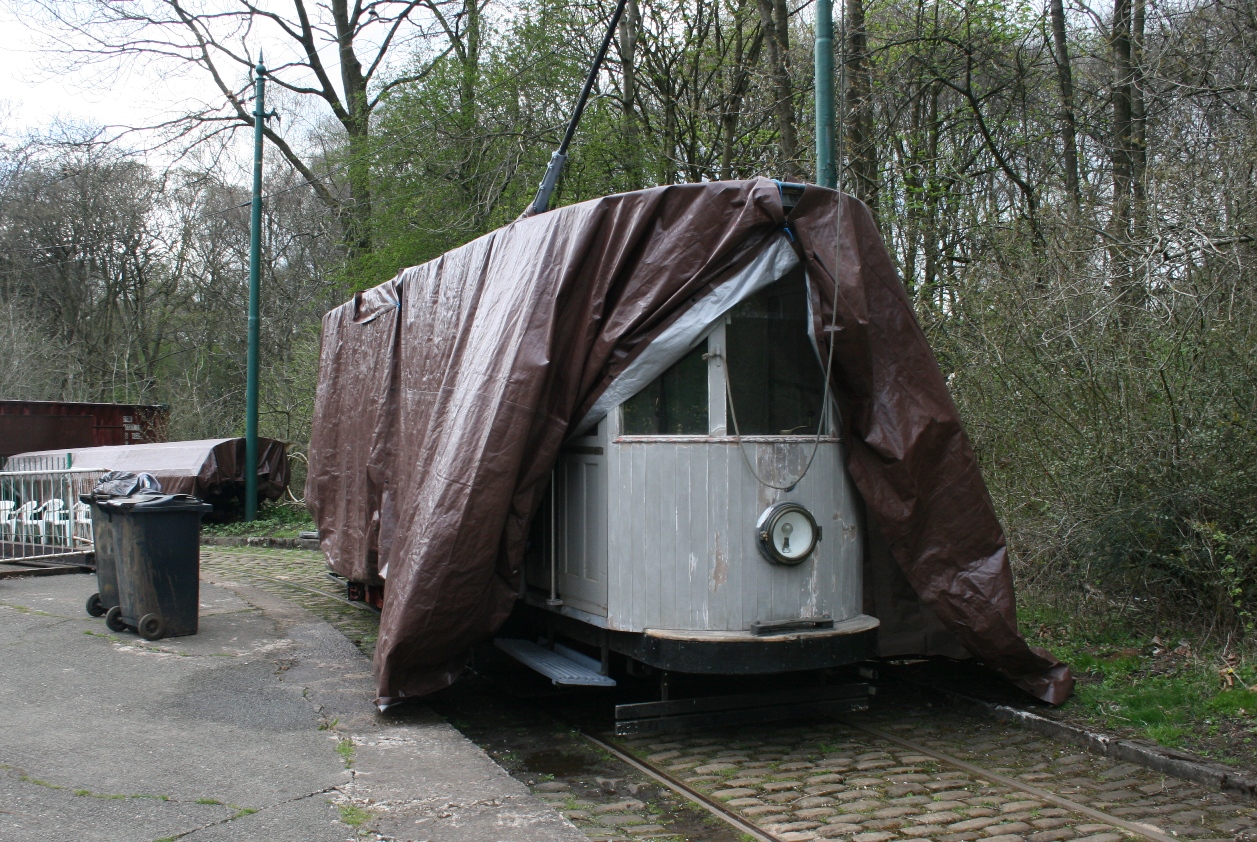 When the tramway is not open Leeds 6 is normally stabled in front of the depot protected by tarpaulins, as shown here. Notice the repainted platform steps, as well as the absence of any external fleet numbers. (Photo by Joe Savage)