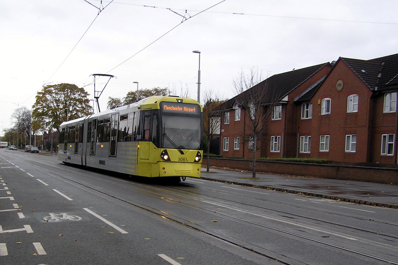 3061 is seen here on Hardy Lane as with a service to Manchester Airport. It is about to leave street running as it will shortly cross the River Mersey and head on to Sale Water Park. (Photograph by Keith Chadbourne, 1st November 2020)