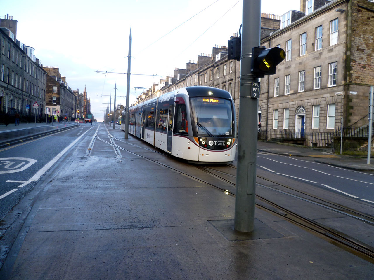 This photo is of 253 which is just arriving at the stop from the Airport. The red sandstone spies of the Scottish National Portrait Gallery in the distance are just beyond the point the tramway turns left into North Saint Andrew Street to reach St Andrew Square stop. (Photograph by Roy Calderwood, 7th December 2020)