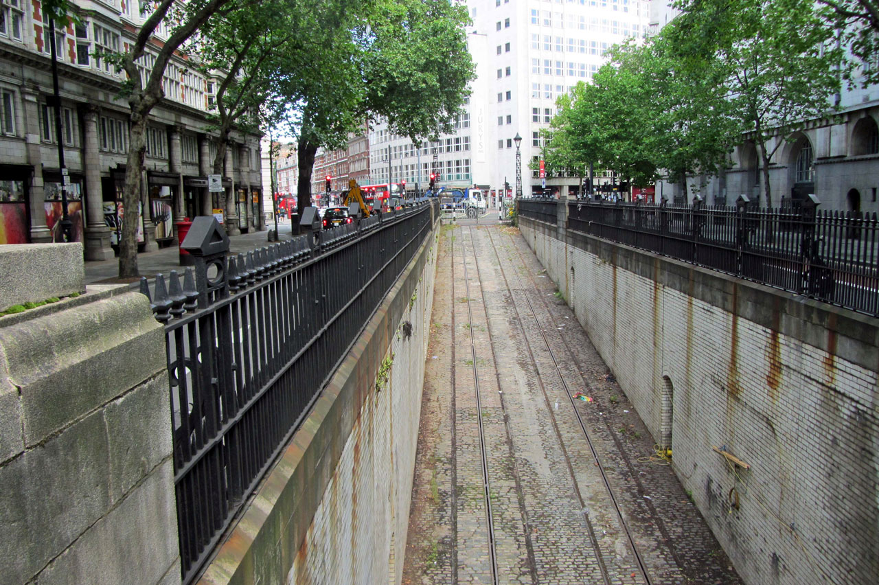 The Theobalds Road entrance of the Tunnel showing the track still in place, nearly seventy years since trams last ran.