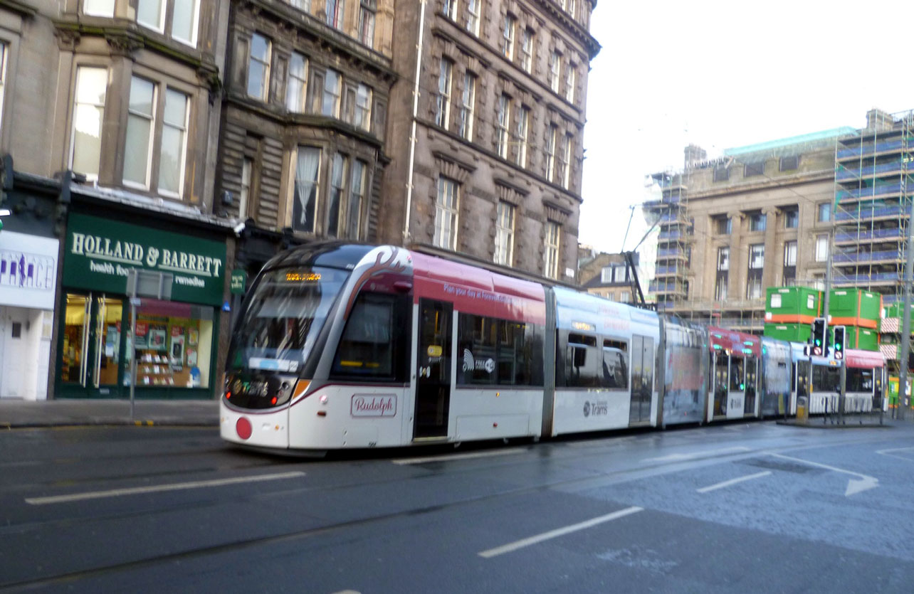 255 is seen here citybound at Shandwick Place showing off its antlers, nose and name. The building in scaffolding behind the tram is the former Frasers department store which is now being transformed into the Johnnie Walker whisky attraction due to open in 2021. (Photograph by Roy Calderwood, 28th December 2020)