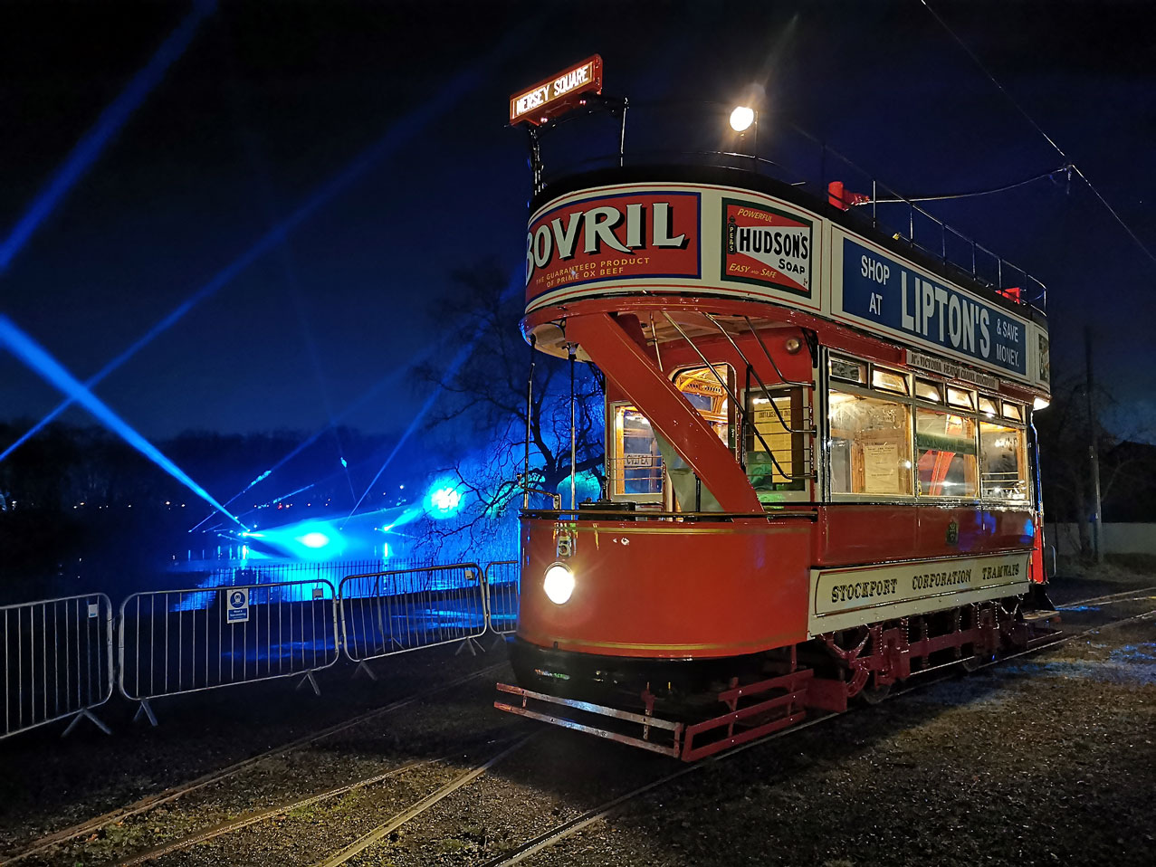 Some of the lighting of Lightopia can be seen across the lake as Stockport 5 stands waiting at the new Lakeside terminus.