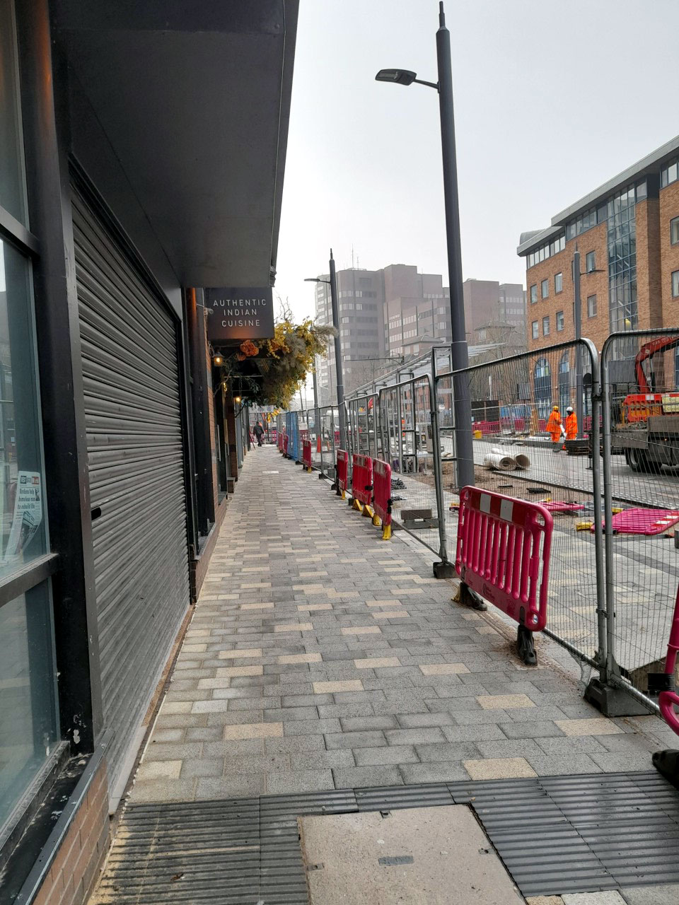 Work continues on the tramstops as seen here along Broad Street. Beyond the fencing you can see the platform shelters being erected with some of the final surfacing to follow.