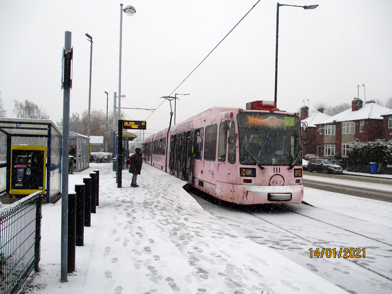 At Middlewood where a lone passenger stands on the cold snow bound platform with 111 waiting for departure.