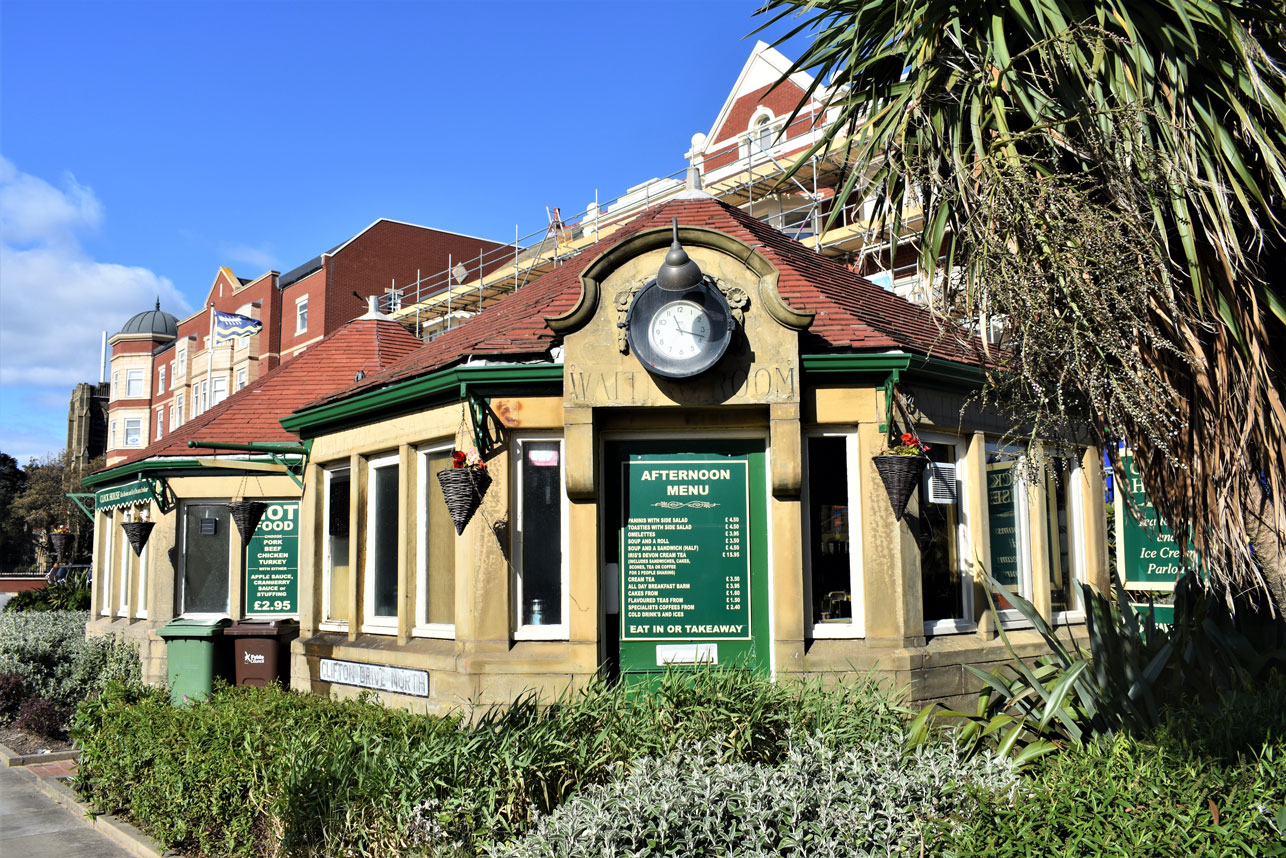 The building today as the Clock House Café. This pavilion is the original shelter as built in 1918 and this would have been the original passenger entrance. Note the “WAITING ROOM” wording above the door and the later addition of a clock.