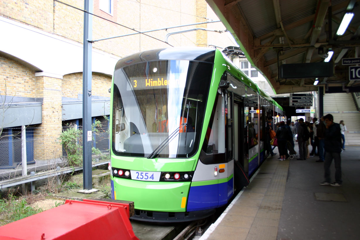 On 4th April 2012 and less than a week after it had carried its first passengers 2554 was out again running a special service from Wimbledon to East Croydon. We first see the tram awaiting departure at Wimbledon.
