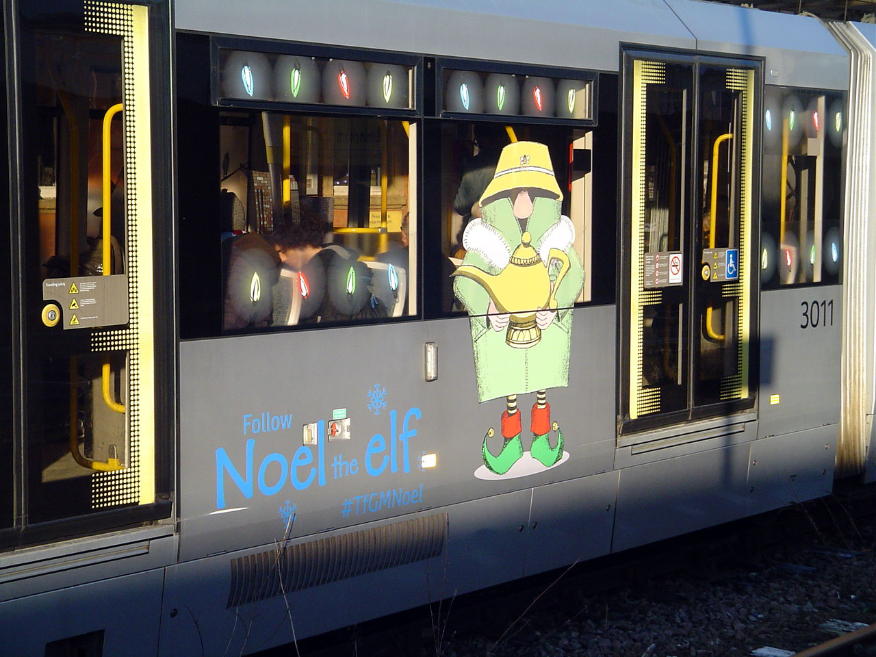 A close-up of one of Noel the elf vinyls; there are four different versions on the side of the tram. (Both Photographs by Dave Elison)