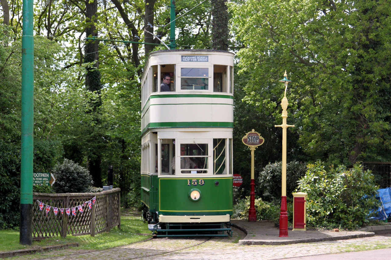 Blackpool 159 comes out of the woods and back to the museum street.