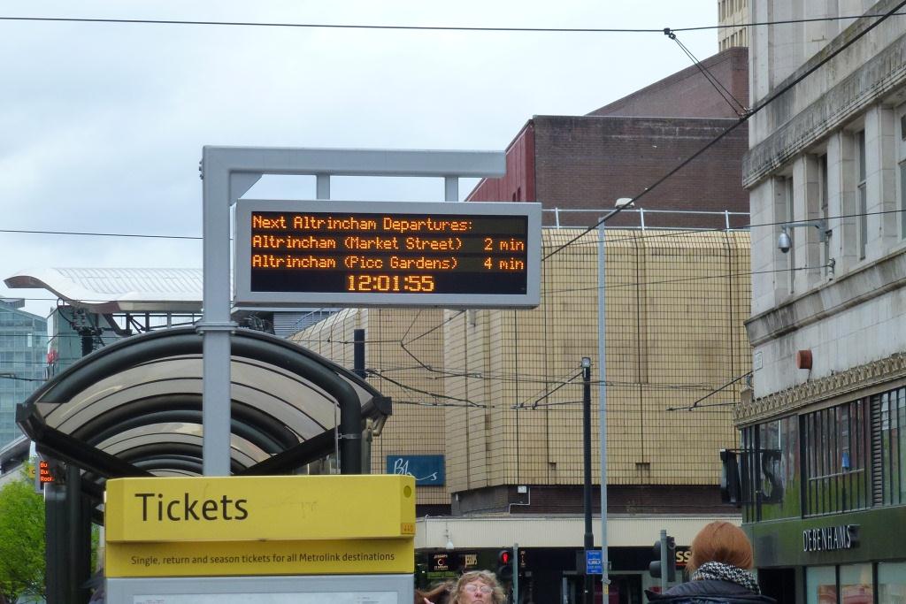 The displays at Market Street and Piccadilly Gardens alternate between the next departures from that stop and the stop to catch the next Altrincham service from. This view shows the inbound platform display at Market Street with the next Altrincham departures.