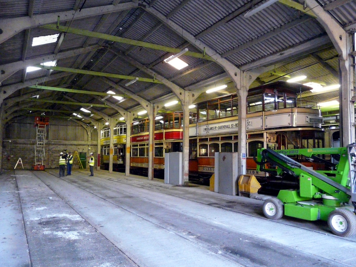 Monday 6th November and with a very empty Depot II work is in hand to remove the overhead to allow the refurbishment work to commence. (Photograph by Crich Tramway Village)