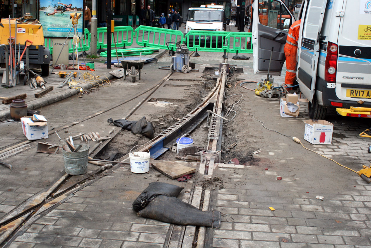 Sunday 22ndOctober saw engineering works in the city centre which saw trams between Bury and Altrincham diverted via 2CC. The works were concentrated in Piccadilly Gardens as seen here. (Photograph by Martin Miller)