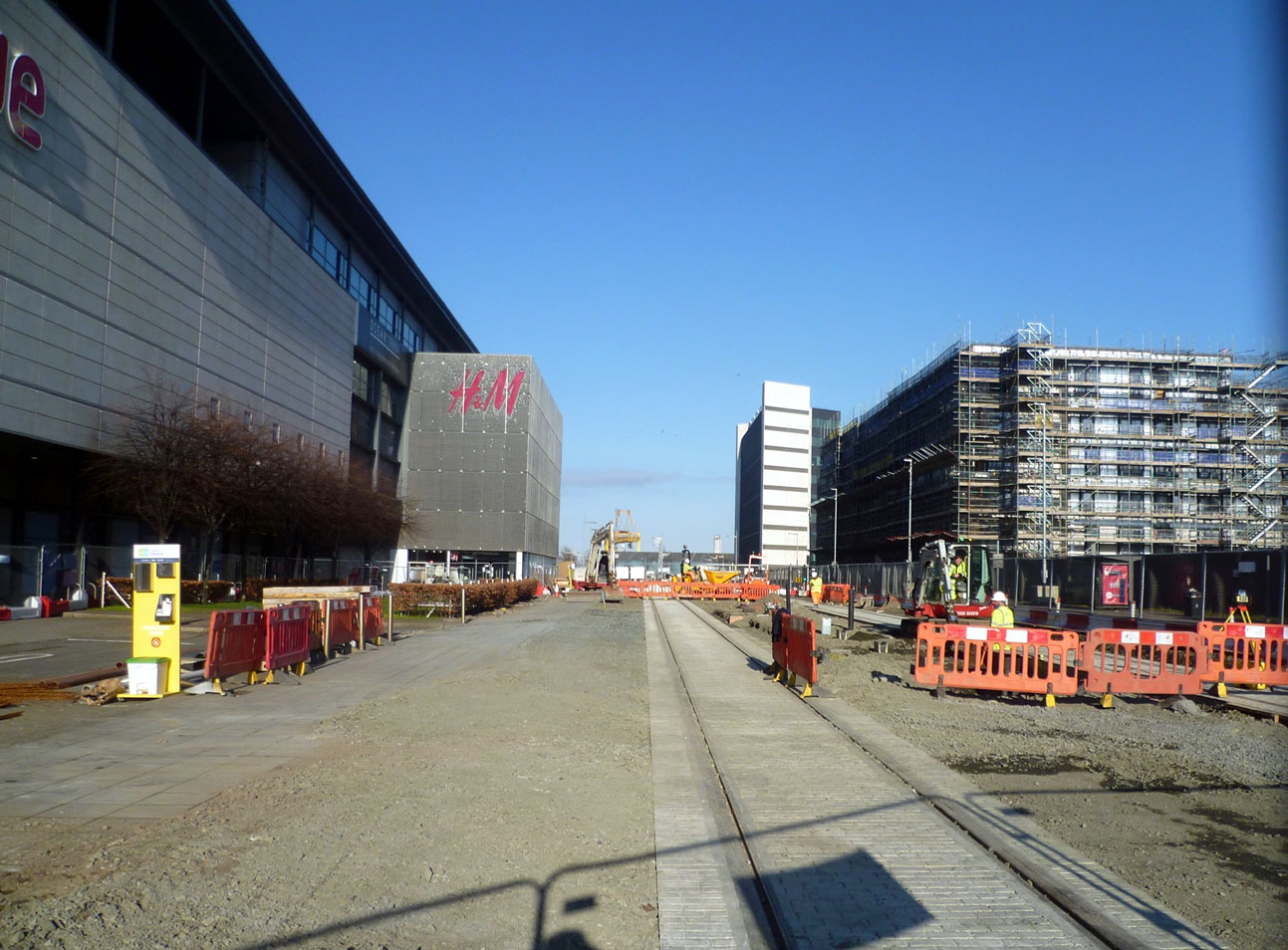 This image is the northeast view with the city and Airport bound track on the left and the Newhaven bound track less obvious on the right. The shopping centre is to the left with the Ocean Point office block in the distance (one of whose occupants is Visit Scotland). Trams to the Airport will turn right at a signalised junction and continue along Ocean Drive, passing between the new flats and Ocean Point as they do. An island platform will be provided here.