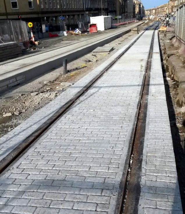 The track just north of the junction with Annandale Street shows on the left the brushed surface finish to the concrete which indicates that the track will be shared between tram and ordinary traffic whereas on the right the surface finish is with impressed sets which will be tram only.