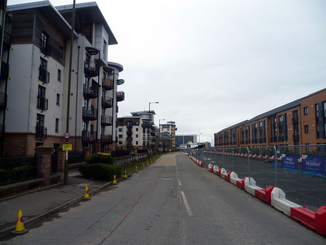 This is looking west from Ocean Drive in Leith with Stevedore Place flats on the right and the Constitution Place flats on the left. The Port of Leith tramstop will be located in the middle distance with an island platform. Also visible in this photo are the former Leith Dock Commission offices (the stone building on the left in front of the furthest block of flats) at Tower Place, the mv Fingal ship (a former Northern Lighthouse Board lighthouse tender and now a floating hotel) and Ocean Point office block just beyond the ship. The tram line will pass to the left of the mv Fingal and then crosses the Water of Leith as the river enters the modern port. (Photograph by Roy Calderwood, 10th March 2021)