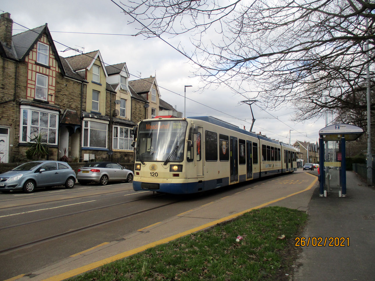 Here we see 120 operating a Yellow route service to Meadowhall as it runs along Middlewood Road passing the junction with Dixon Road. (Photograph by Stuart Cooke, 26th February 2021)