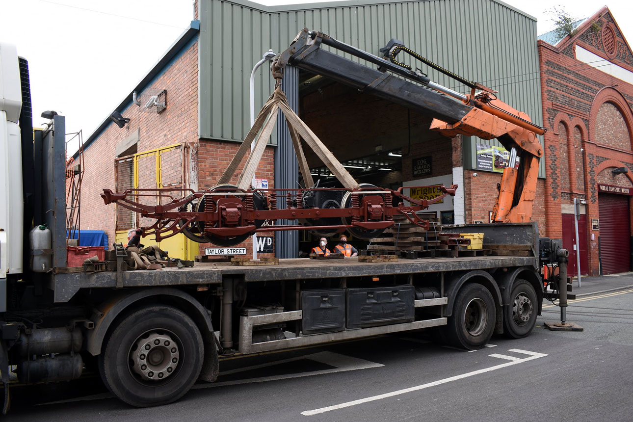 The truck starts to be unloaded outside the Wirral Transport Museum on Taylor Street,