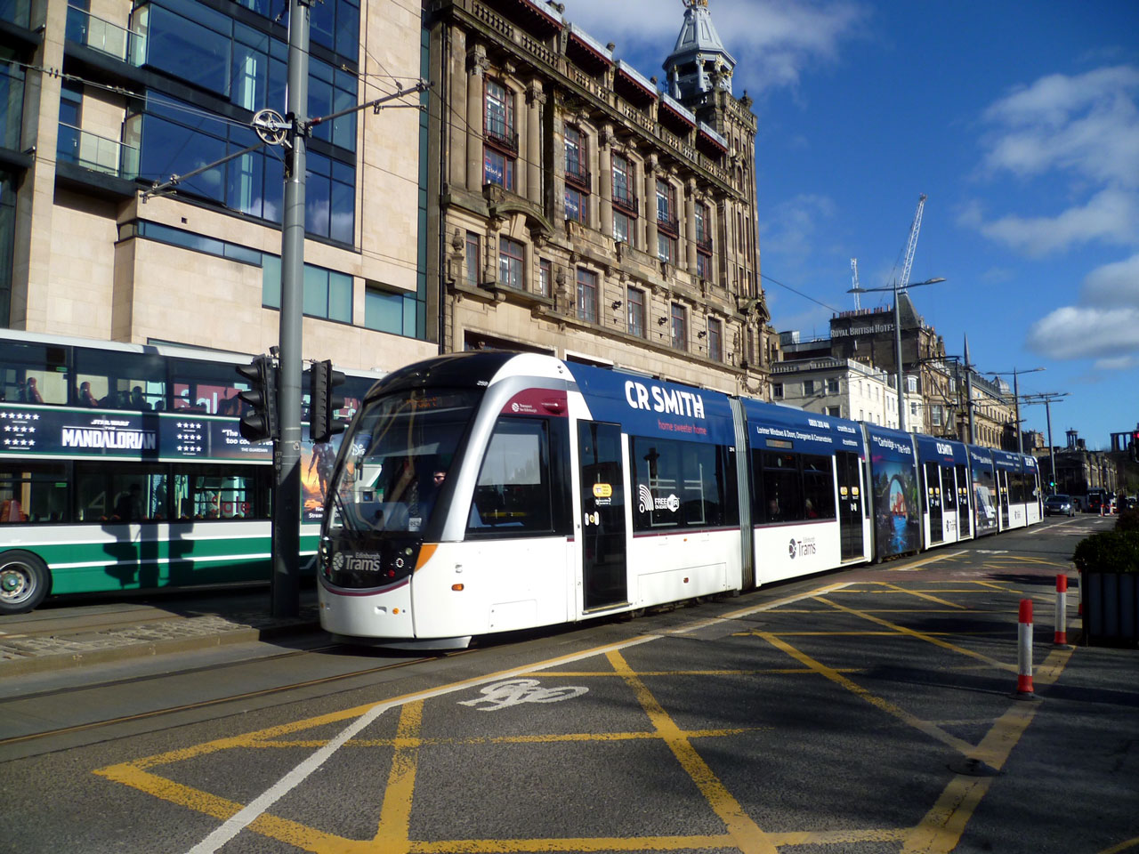 In this photo we see 259 having just turned the corner from South Saint Andrew Street onto Princes Street and is passing the junction (on the right) with Waverley Bridge. The bridge is currently closed off under the Spaces for People arrangements and in the long-term the Council have aspirations for this to be a permanent closure as part of the City Centre Transformation Plan. The tram is just passing where a new stop may be constructed in the future to provide better access to Waverley Railway Station and could also be served by the proposed Northwest/Southeast tram service from Granton to the BioQuarter. (Photograph by Roy Calderwood, 26th February 2021)