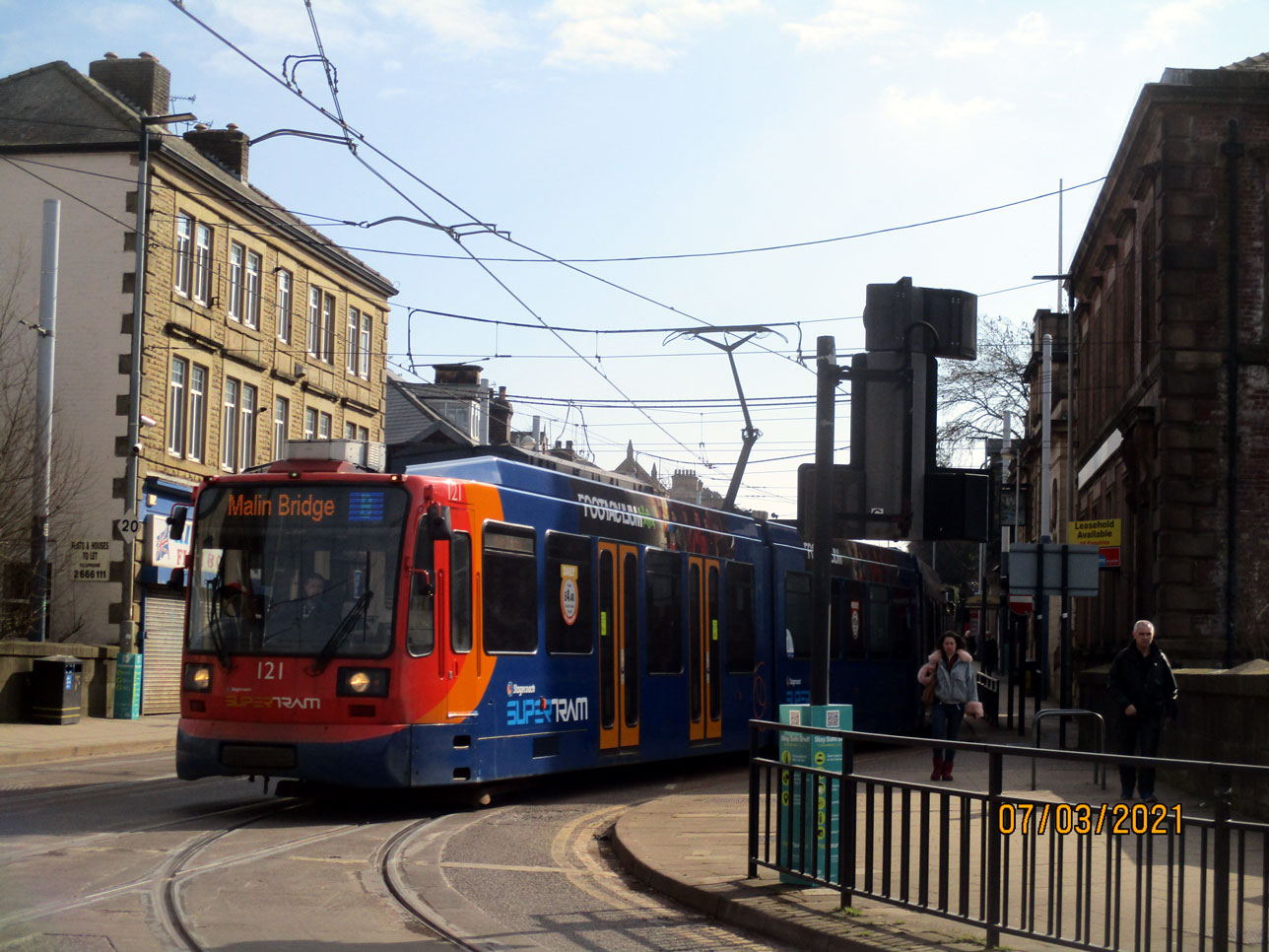 Here we see 121, which is running on the Blue route, about to turn left towards the camera onto Holme Lane. (Photograph by Stuart Cooke, 7th March 2021)