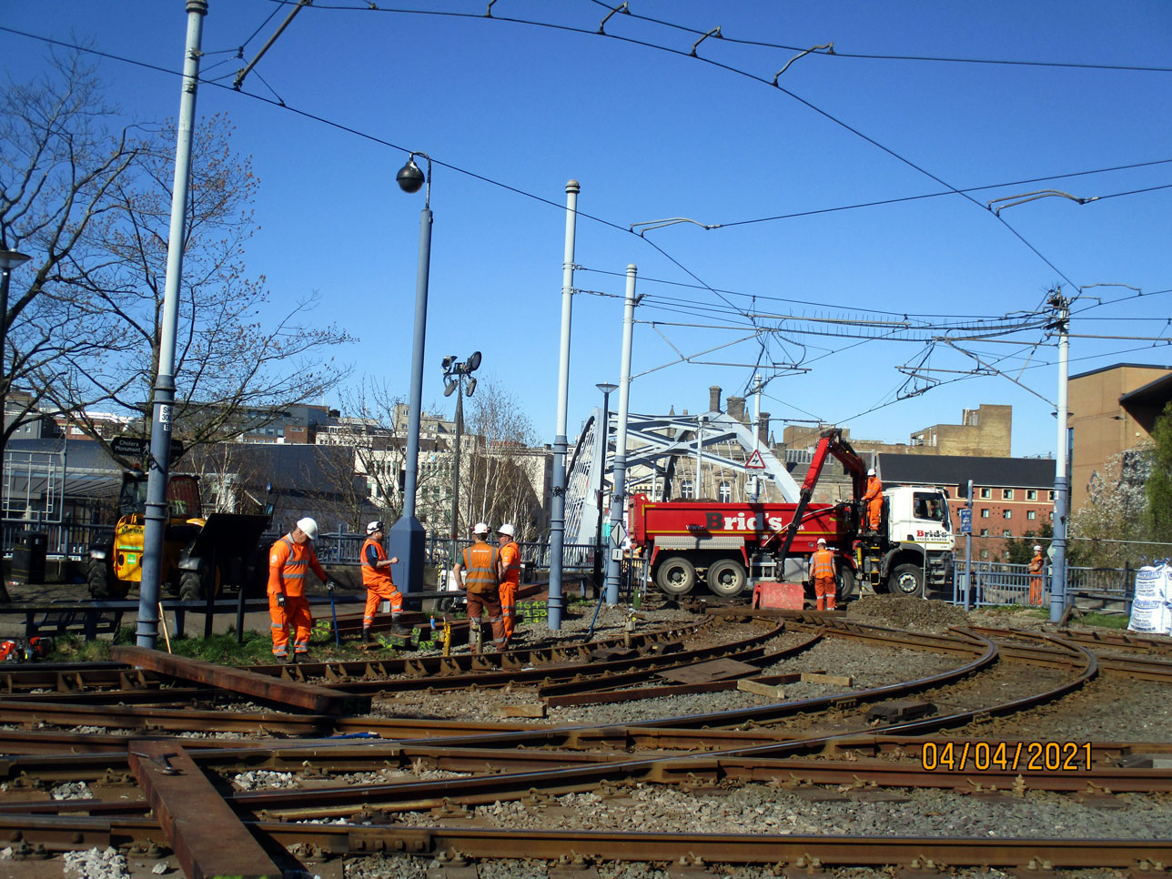 Moving further around now and new ballast is being unloaded from the truck. The Park Square bridge taking trams into the city centre is seen in the background.