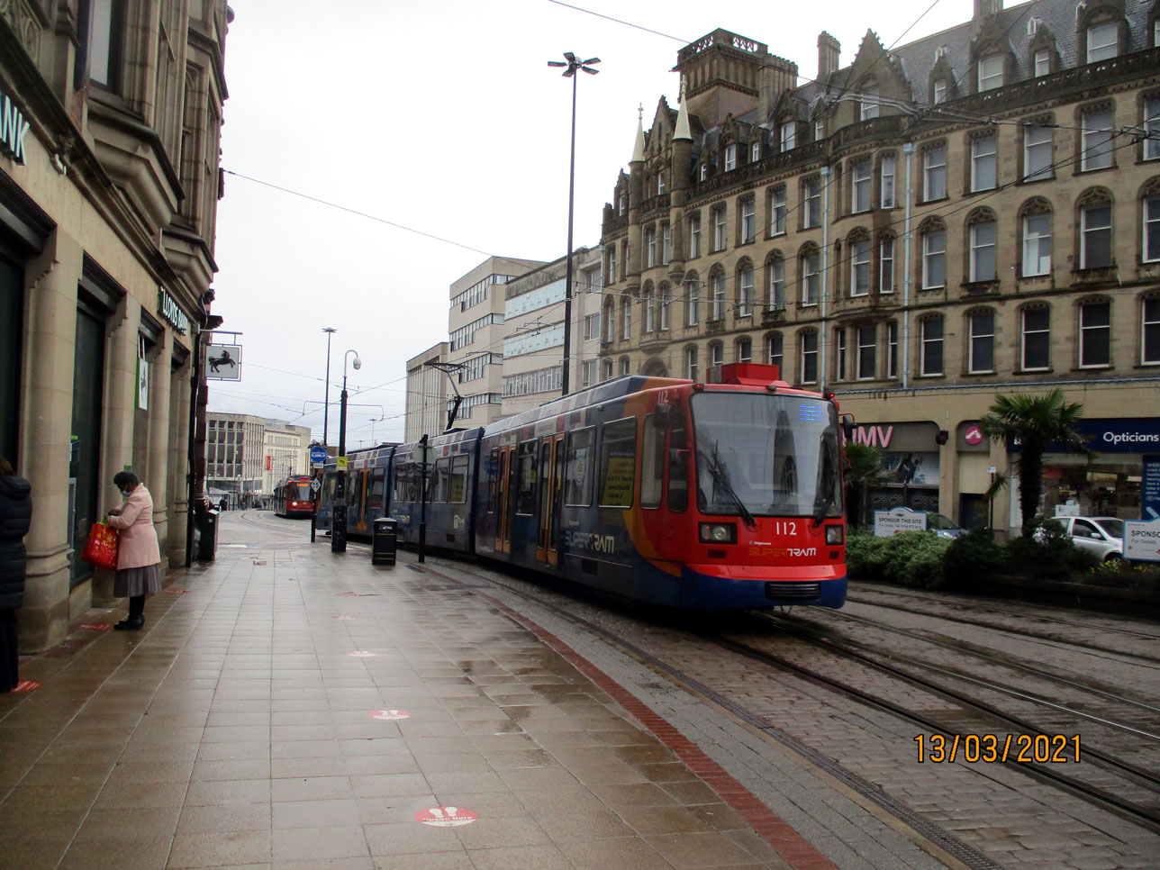 A lady gets some money out the bank on the left but apart from that the number of trams seen here seem to outnumber the people! 112 has just departed from Cathedral as it works a Blue route service to Halfway. (Photograph by Stuart Cooke, 13th March 2021)