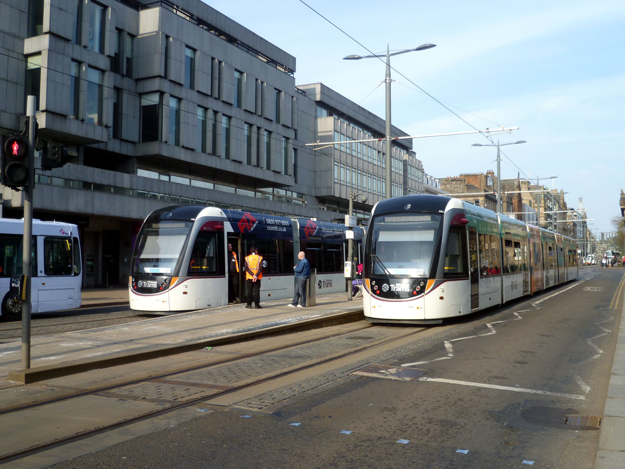 With pantographs lowered 256 and 254 wait at the Princes Street stop for a service to be resumed. This was at 1725, towards the end of the disruption.
