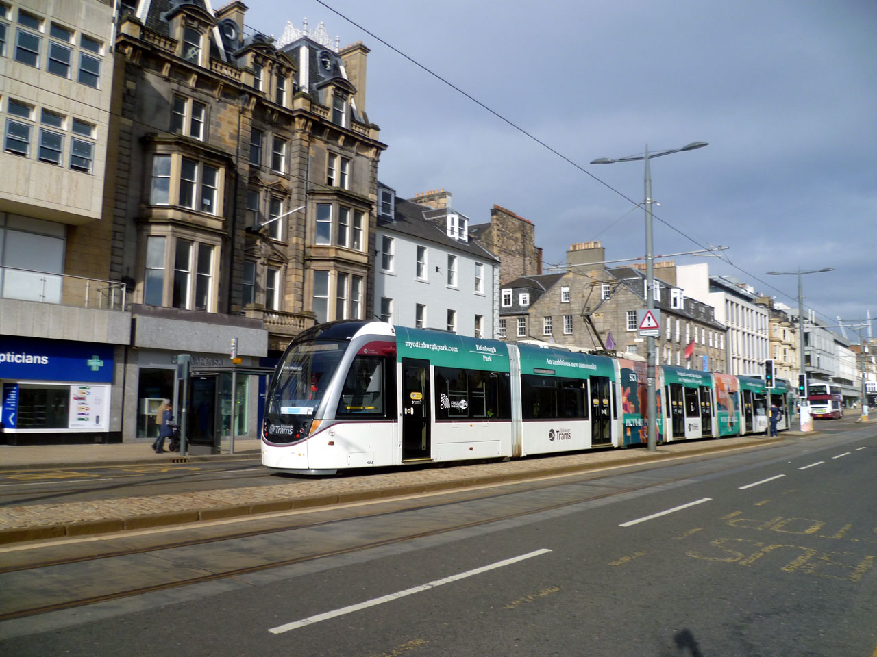 The tram in this image is 271 – which carries adverts for Parabola My Edinburgh Park – which is running along Princes Street with a service heading to York Place. (Photograph by Roy Calderwood, 23rd March 2021)